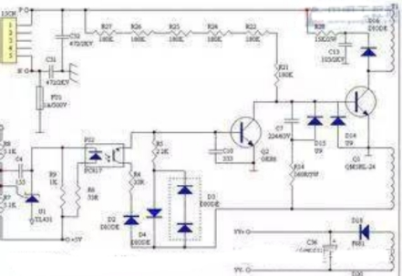 3、維護(hù)回路:PC1芯片本身和3腳外圍元件R4構(gòu)成過流維護(hù)回路;N1繞組上并聯(lián)的D2、R6、C4元件構(gòu)成了IGBT的維護(hù)電路;實(shí)質(zhì)上穩(wěn)壓回路的電壓反應(yīng)信號——穩(wěn)壓信號,也可看作是一路電壓維護(hù)信號。但維護(hù)電路的內(nèi)容并不僅是局限于維護(hù)電路本身,維護(hù)電路的起控往往是因?yàn)樨?fù)載電路的異常所引起。