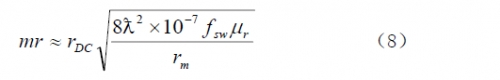 電阻損耗是變壓器或電感內部繞組的電阻產生的損耗。有兩種方式的電阻損耗:直流電阻損耗和集膚效應電阻損耗。直流電阻損耗由繞組導線的電阻與流過的電流有效值二次方的乘積所決議。集膚效應是因為在導線內強溝通電磁場效果下,導線中心的電流被推向導線表面而使導線的電阻實踐添加所造成的,電流在更小的截面中活動使導線的有效直徑顯得小了。式(8)給出了這兩個損耗在一個表達式中的計算式。