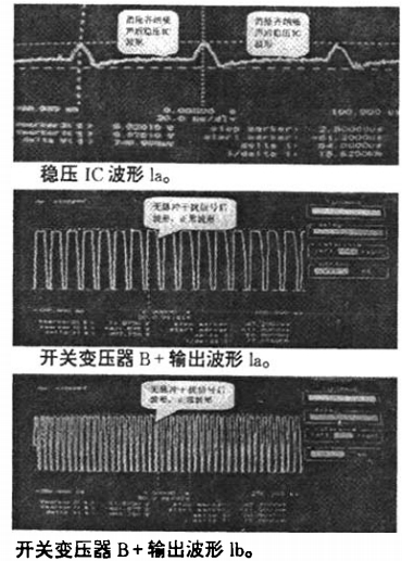 經過在TL431并聯0.47/63V電容后,再次檢驗TL431穩壓TC負極波形,不規則噪聲頻率消逝(如圖穩壓ICla);檢驗開關變壓器次級B+波形(如圖開關變壓器次級B+波形1a、1b),波形中130uS-70uS周期脈沖煩擾信號消逝;此時再也聽不到變壓器“哧哧”響聲。細致檢驗經上述更改后整機哧、哧聲消逝,并且對正常作業無任何影響。使電源作業更安穩。