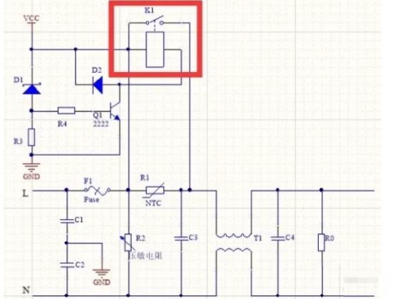 開關電源中初期階段繼電器是斷開的。當VCC逐步到達自身電壓的時候,穩壓二極管D1導通,三極管Q1翻開,繼電器K1閉合,相當于把限流NTC熱敏電阻R1短路。