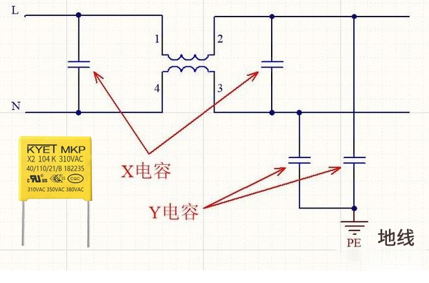 開關(guān)電源中的安規(guī)電容一般有X電容和Y電容,X電容是安裝在零線與前方之間,Y電容一般是安裝在地線與前方或地線與零線之間,具體的用法如下圖所示: