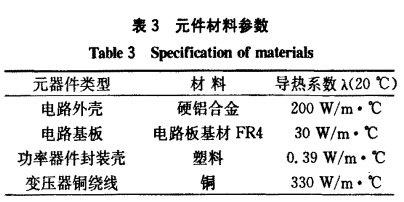 3)功耗參數(shù):本例電源系統(tǒng)的主要發(fā)熱元件共有16個(gè),電路中主要發(fā)熱器件各接觸面的損耗可由(4)式求得,其中變壓器的損耗可分別由文獻(xiàn)[3]中的銅損及鐵損的計(jì)算公式分別求得。本例中將計(jì)算得到的各個(gè)主要發(fā)熱元器件的功率損耗值,依照參數(shù)類型歸類整理,如表2所示。