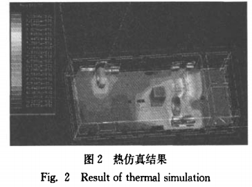 依據(jù)主要發(fā)熱元器件的損耗計(jì)算公式,得到各損耗值,將其導(dǎo)入仿真軟件;應(yīng)用Ansoft仿真軟件的內(nèi)部求解器取得實(shí)踐電路的3D發(fā)熱模型,如圖2所示。從圖中能夠明晰地看到電路內(nèi)部及各個(gè)元器件上的熱量散布狀況。依據(jù)仿真結(jié)果(圖2)可知,功率MOSFET上的熱量和變壓器的熱量最高(紅色局部),這與從電路理論上剖析求得的這兩種器件的功耗(見(jiàn)表2)相吻合。